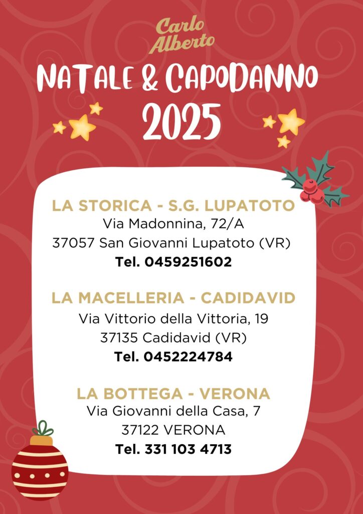 Il 24/12 tutti i punti vendita saranno aperti con orario continuato fino alle 13.00. La Bottega di Verona aprirà alle ore 10.00.