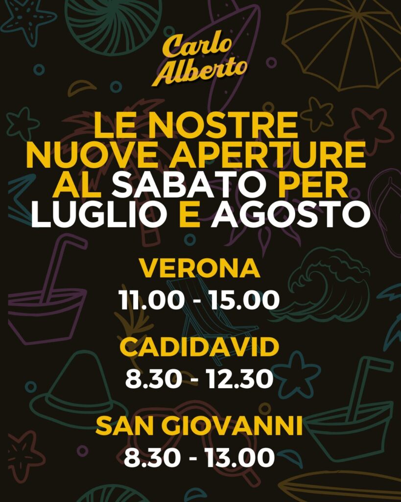 Per tutto il mese di Luglio e Agosto, i nostri punti vendita rimarranno chiusi il sabato pomeriggio.